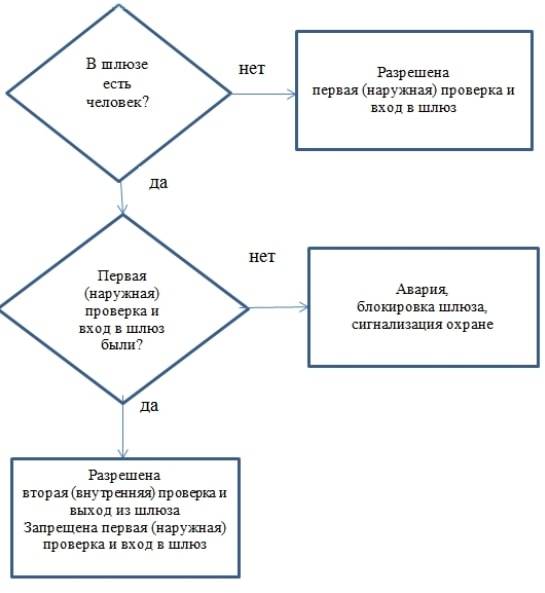 После входа в шлюз человек оказывается в замкнутом пространстве, выход из которого возможен только после прохождения процедуры проверки. Вход в шлюз может быть организован различными способами: автоматически после проверки идентификатора личности (электронной карты, биологического признака и др.), от пульта охранника и др.