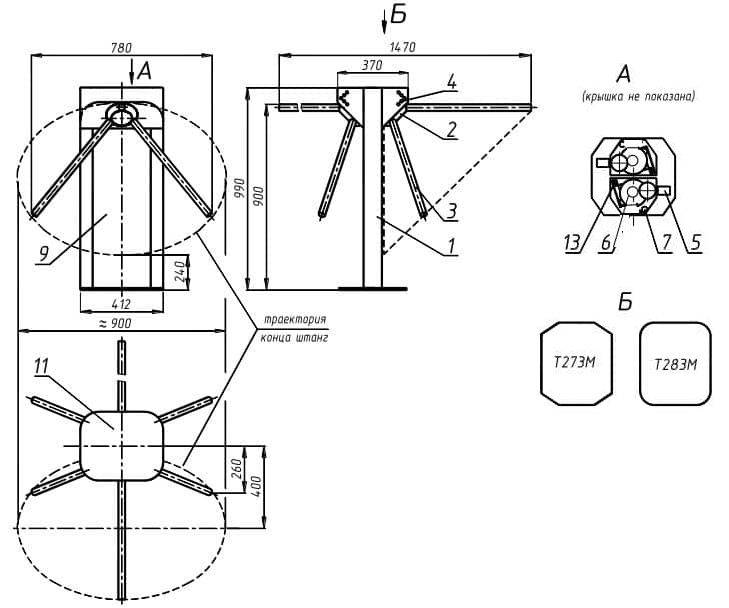 В турникетах всех модификаций предусмотрены отверстия для ввода кабеля: с тыльной стороны турникета (в двухпроходных турникетах Т273М1 и Т283М1 – с боковых сторон) и в основании – для случая, когда провода от турникета проходят под полом.