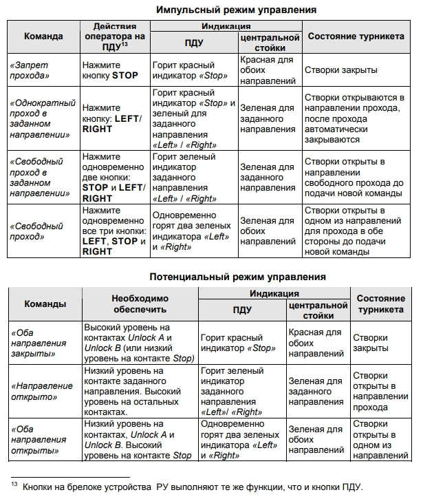 3. При импульсном режиме управления на турникет автоматически подается команда «Запрет прохода», при потенциальном – «Оба направления закрыты» до подачи любой следующей команды с внешнего контроллера. Турникет готов к работе.