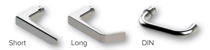 • Нажимные ручки: Доступны в исполнениях с короткой и длинной рукояткой. Наружная ручка может свободно вращаться вверх и вниз в запертом режиме. Ручки в соответствии с DIN доступны в качестве опции